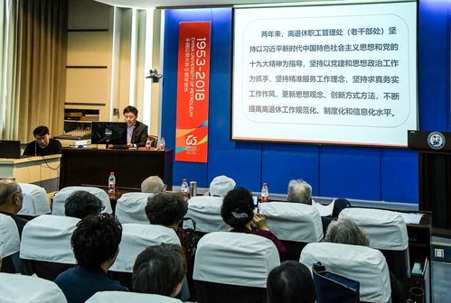 接下来离退处党委书记、处长高广学同志对两年来的离退休工作情况、存在问题及下一步工作打算等三个方面作了通报。通报从离退休工作机制、基层党建、服务保障、文化养老、老有所为、信息化规范化建设等六个方面回顾了近两年来离退休工作所取得的成绩,同时也指出了在精准化教育管理、老有所为、服务保障、工作协调沟通、两校区平衡性、人员编制等方面存在的困难和问题,并从六个方面简要阐述了下一步工作打算,以“让学校放心、让老同志满意”为根本目标任务,为学校和谐稳定、“双一流”建设做贡献。