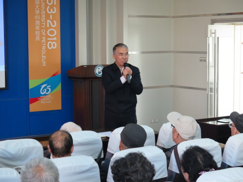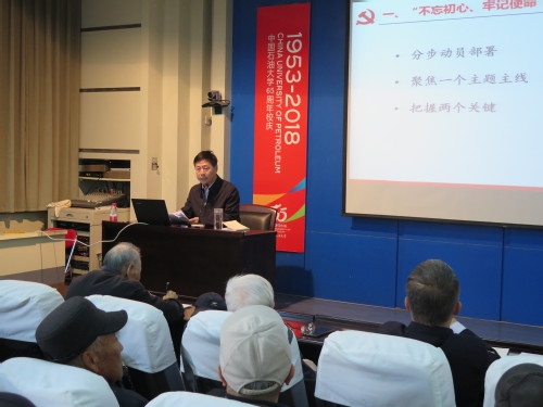 根据学校“不忘初心、牢记使命”主题教育安排和离退处党委主题教育计划,10月25日上午,离退处党委书记、处长高广学在东营校区视频会议室以《坚定理想信念,不忘初心使命,努力加强和改进离退休工作》为题,为离退处党委委员、支部书记、支部委员、党员代表以及在职党员等100余名党员讲党课。党课由离退处党委副书记刘欢主持,学校主题教育第八指导组成员、东营校区综合办公室主任綦磊参加指导。