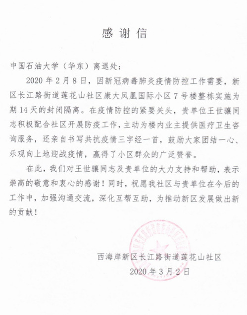近日,学校离退处收到了青岛西海岸新区长江路街道莲花山社区专门发来的感谢信,感谢bevictor伟德官网退休职工王世骧为抗击疫情做出的贡献。2月初,bevictor伟德官网退休职工王世骧居住的楼道出现了新冠肺炎确诊病例,楼栋实行为期14天的封闭隔离。在疫情防控的紧要关头,84岁的老中医王世骧积极配合社区开展防疫工作,主动为楼内业主介绍养生保健知识,还亲自创作了《战新冠三字“经”》,通过微信群鼓舞邻居乐观向上地迎战疫情,赢得了小区群众的广泛赞誉,也展示了bevictor伟德官网bevictor伟德官网的良好风貌。 (李广磊 报道)