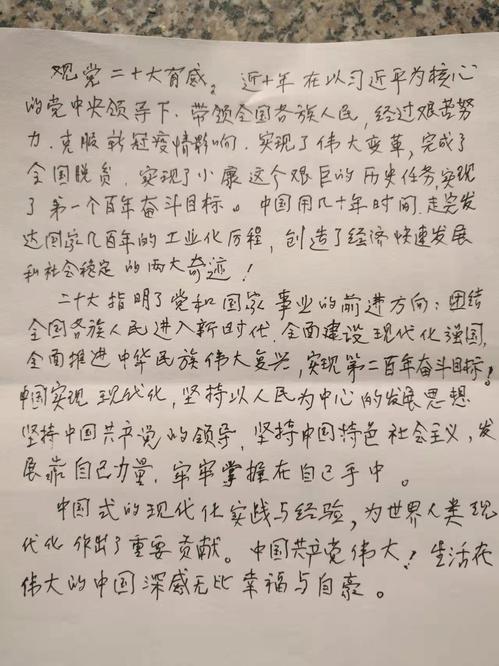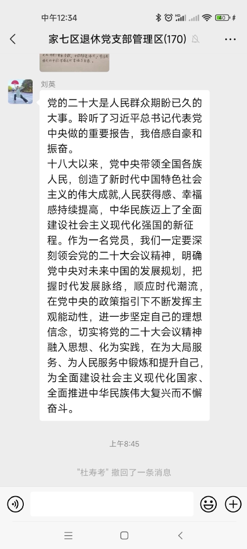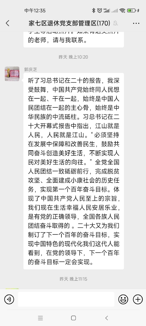 党支部书记宋锡周表示,党的二十大报告催人奋进、鼓舞人心,新时代中国特色社会主义理论深入人心,中国式现代化强国建设宏伟蓝图振奋人心,在党的领导下,实现了幼有所育、学有所教、劳有所得、病有所医、老有所养、住有所居、弱有所扶,祖国的水更绿、山更青、天更蓝,国家繁荣昌盛,社会和谐稳定,人民安居乐业,今后一定会战胜千难万险,赢得更大的胜利,我们充满信心!