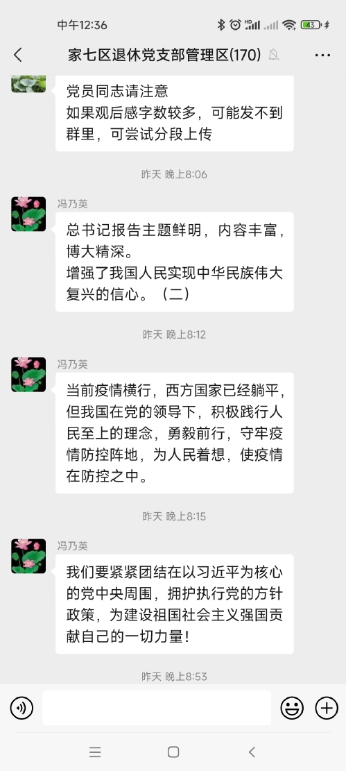 根据bevictor伟德官网管理处党委《bevictor伟德官网认真学习贯彻党的二十大精神和学校第十二次党代会精神的通知》要求,10月21日,家七区党支部开展“庆祝二十大召开 畅谈学习体会”线上观后感交流活动,全体党员在前期认真收听收看大会盛况、认真学习二十大报告的基础上,结合自身实际,撰写感想体会,并在微信工作群里交流分享。