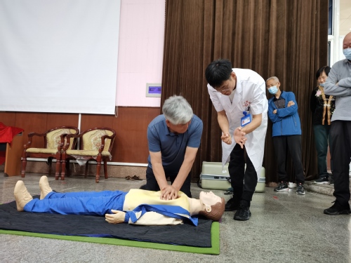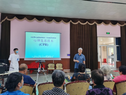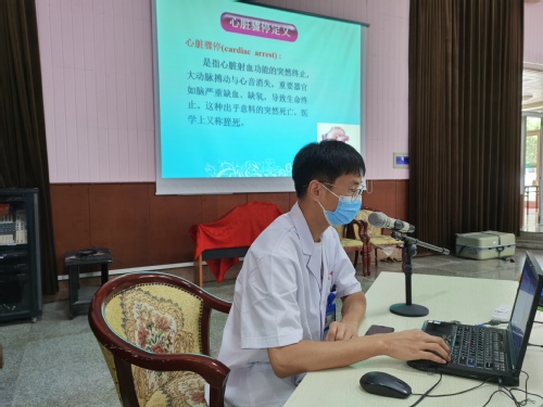 讲座分为三个环节,第一个环节是由校医院郭海洋大夫授课。郭大夫以《心肺复苏技术》为题,结合PPT演示和动画视频,从心脏骤停的诊断要点、心肺复苏操作方法、心肺复苏终止指征、现场急救复苏的程序、心脏骤停的原因等五个方面进行讲解,为大家上了一堂生动的专业急救知识课。