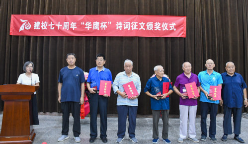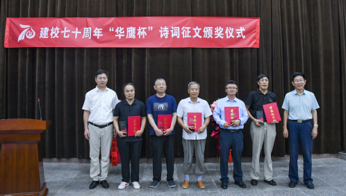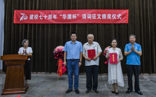 活动现场,诗歌协会秘书长程国忠首先宣读了建校七十周年“华鹰杯”诗词征文获奖通知,接着颁奖嘉宾为获得优秀奖、三等奖、二等奖的作者颁发荣誉证书、奖杯。由于一等奖获得者吴文山、熊轲、孙伟均在外地,所以未对一等奖进行现场颁奖