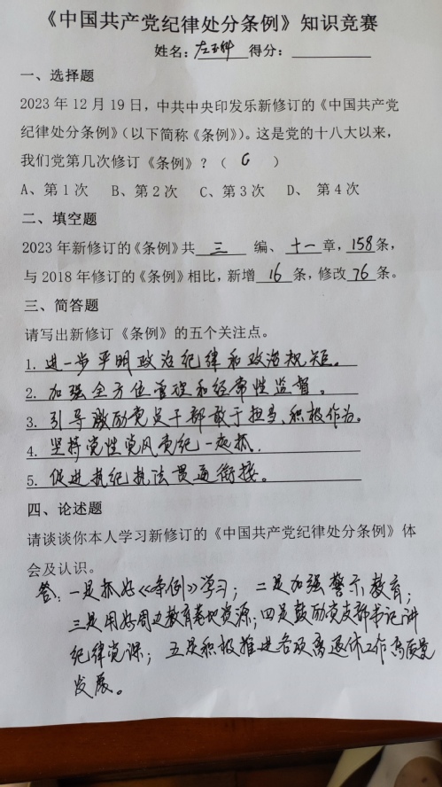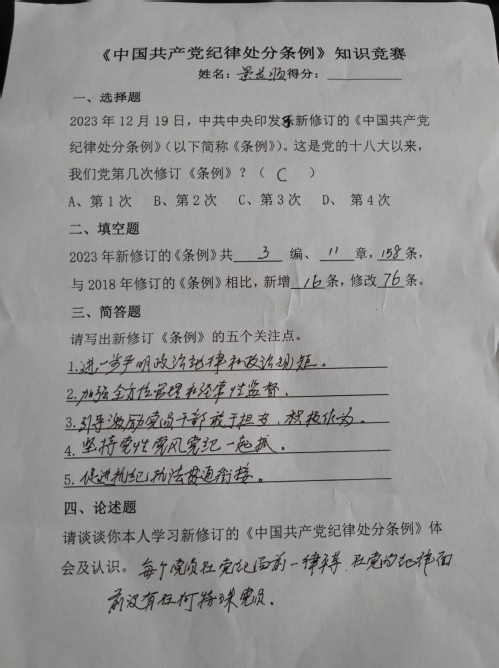 竞赛采取笔试方式进行,试题类型兼顾丰富性和适度性,包含选择、填空、简答、论述等题型。考试内容以新修订的《中国共产党纪律处分条例》为主,旨在增强离休干部对党纪党规知识的学习和理解,进一步引导大家学纪、知纪、明纪、守纪。