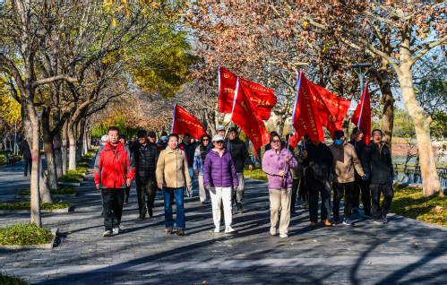 11月19日下午,老同志们在东营科教园区荟萃湖北门广场聚集,各管理区带队沿湖岸步行道环行,赏秋色、话情谊,纷纷驻足拍照留念,现场气氛温馨而热烈。